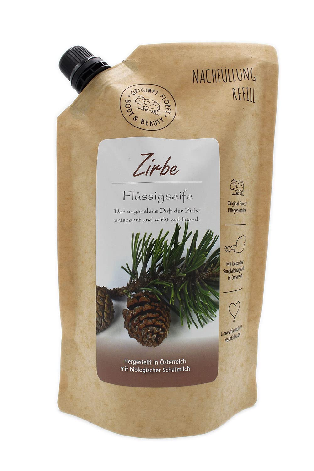 Flüssigseife mit Schafmilch Zirbe, Nachfüll-Beutel 500 ml, mit Etikett modern, von Florex B1661ZB-MC