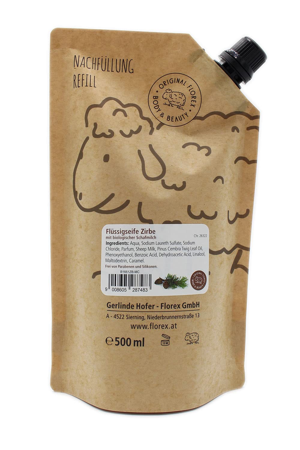 Produktinformationen "Flüssigseife mit Schafmilch Zirbe, Nachfüll-Beutel 500 ml, mit Etikett modern, von Florex B1661ZB-MC"