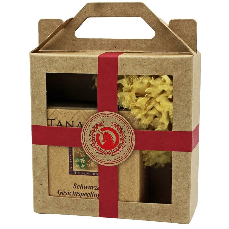 Produktinformationen "Geschenk-Set mini-Tanamera® Schwarze Gesichtspeelingseife 60g, Naturschwamm klein"