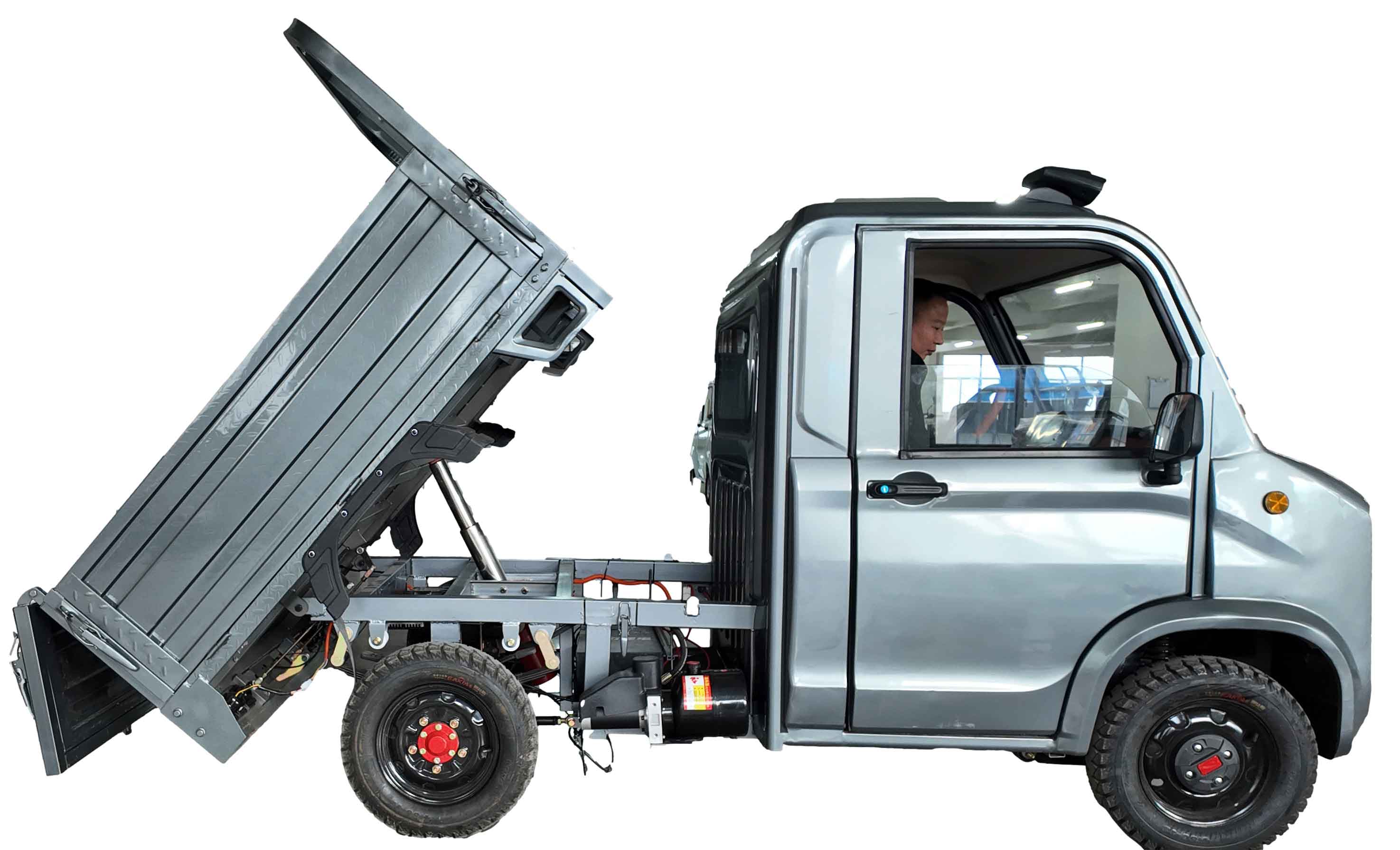 → manuelle Kippfunktion oder Hydraulische Kippfunktion (optional), Doppel-Stahlfederung, große 12-Zoll-Vakuumreifen, 18° Steigfähigkeit.